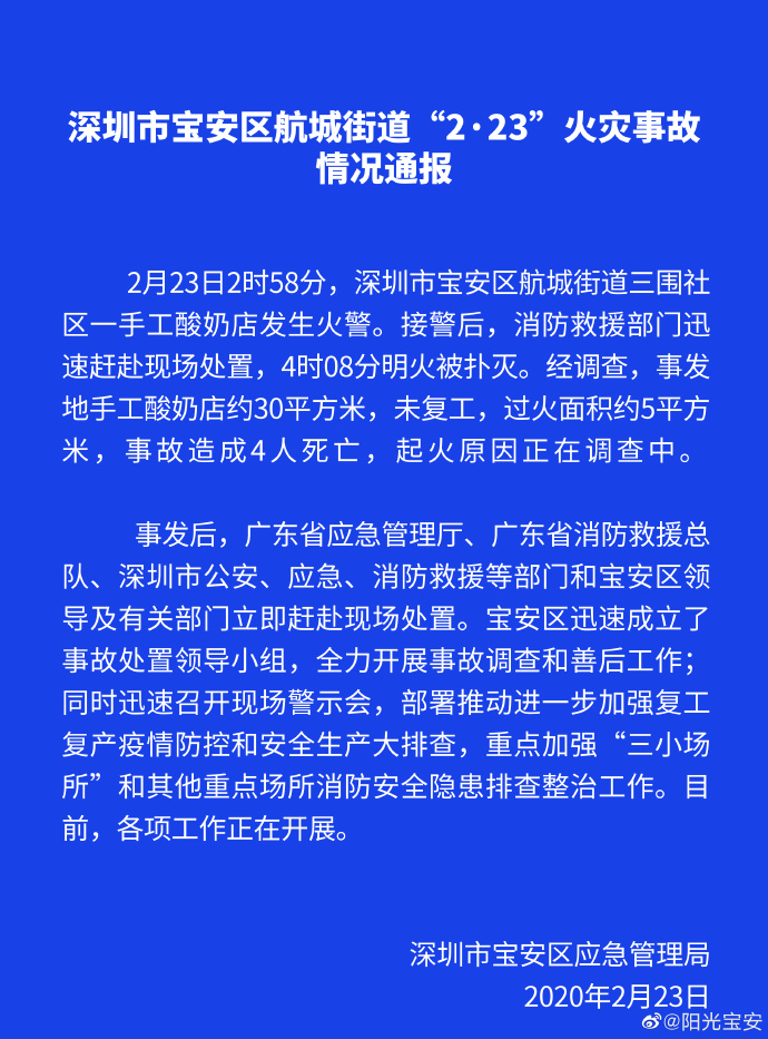 大火無情,在火災發(fā)生的時候,往往不會給人留下任何反應的余地,轉瞬之間就有可能釀成無法挽回的損失,甚至有人還會為此而丟掉性命,因此應對火災最好的措施就是預防,千萬不能有任何粗心大意。2月23日,深圳就發(fā)生了一起火災事故。2月23日下午,深圳寶安區(qū)官微@陽光寶安 發(fā)布情況通報,寶安區(qū)航城街道三圍社區(qū)一手工酸奶店當日凌晨2時58分發(fā)生火災,事故造成4人死亡,目前起火原因正在調(diào)查中。